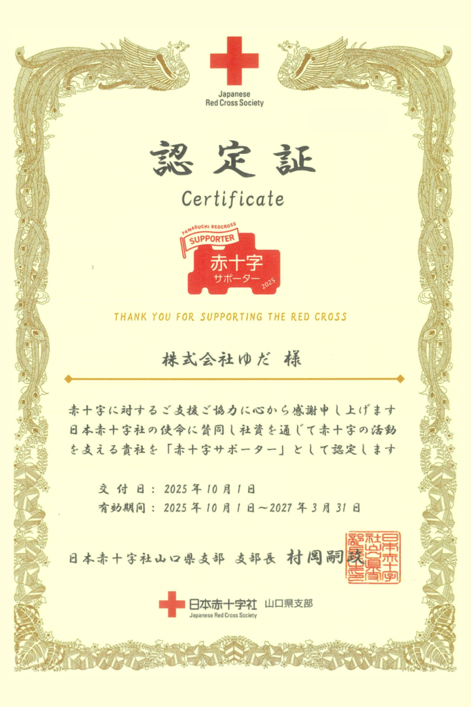 このたび、株式会社ゆだは日本赤十字社 山口県支部様より「赤十字サポーター」として認定を受けました。