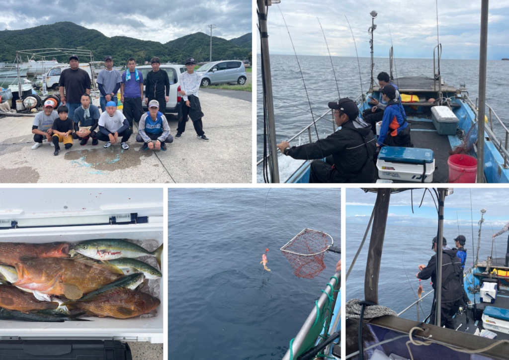 7月は島根半島よりレンタルボート2隻で出船し、ジギング・SLJ・タイラバ・テンヤなど多様な釣法に挑戦しました。各自が工夫を凝らして釣果を上げる中、特に広島営業所のTさんが釣り上げた約50cmのアオハタは稀に見る大物で、大いに盛り上がりました。